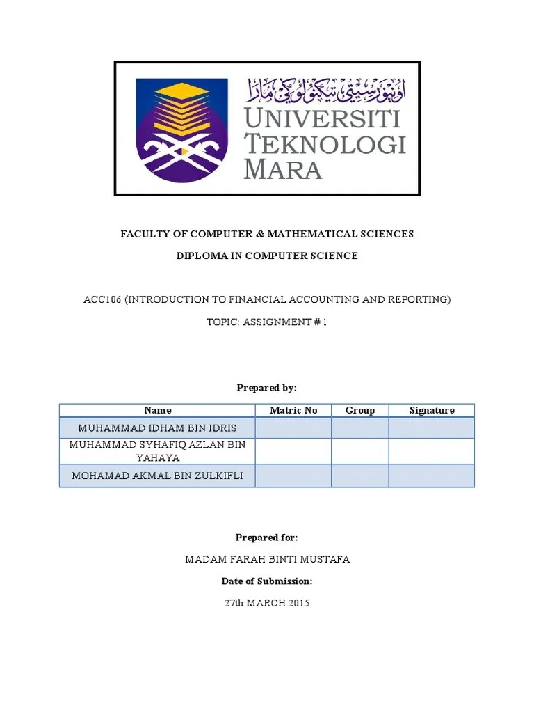 You have just read the article entitled front page assignment uitm. View assignment cover pagedoc from mkt 243 at universiti teknologi mara. Example coverpage and title page for every assignment faculty of information management universiti teknologi mara diploma in information management (im110) Key in the staff id if you are a staff and key in the student id if .